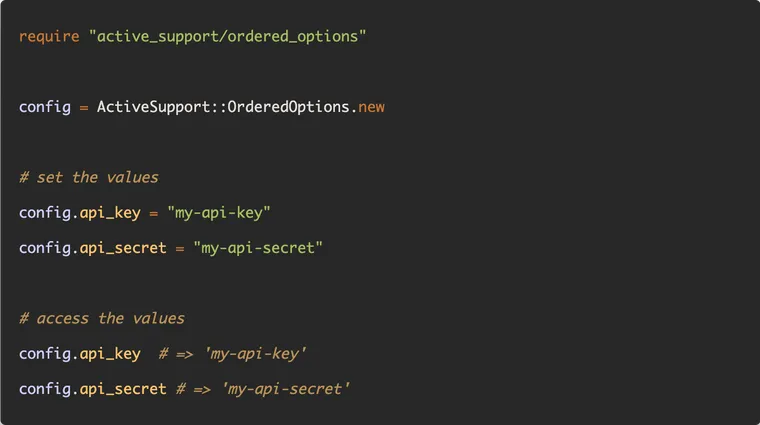 Using the ActiveSupport::OrderedOptions class instead of a regular Hash, you can access the Hash values just like the methods on an object. It's especially useful for configuration-like objects. Rails makes abundant use of this class to configure its sub-frameworks like ActionView and ActiveStorage.